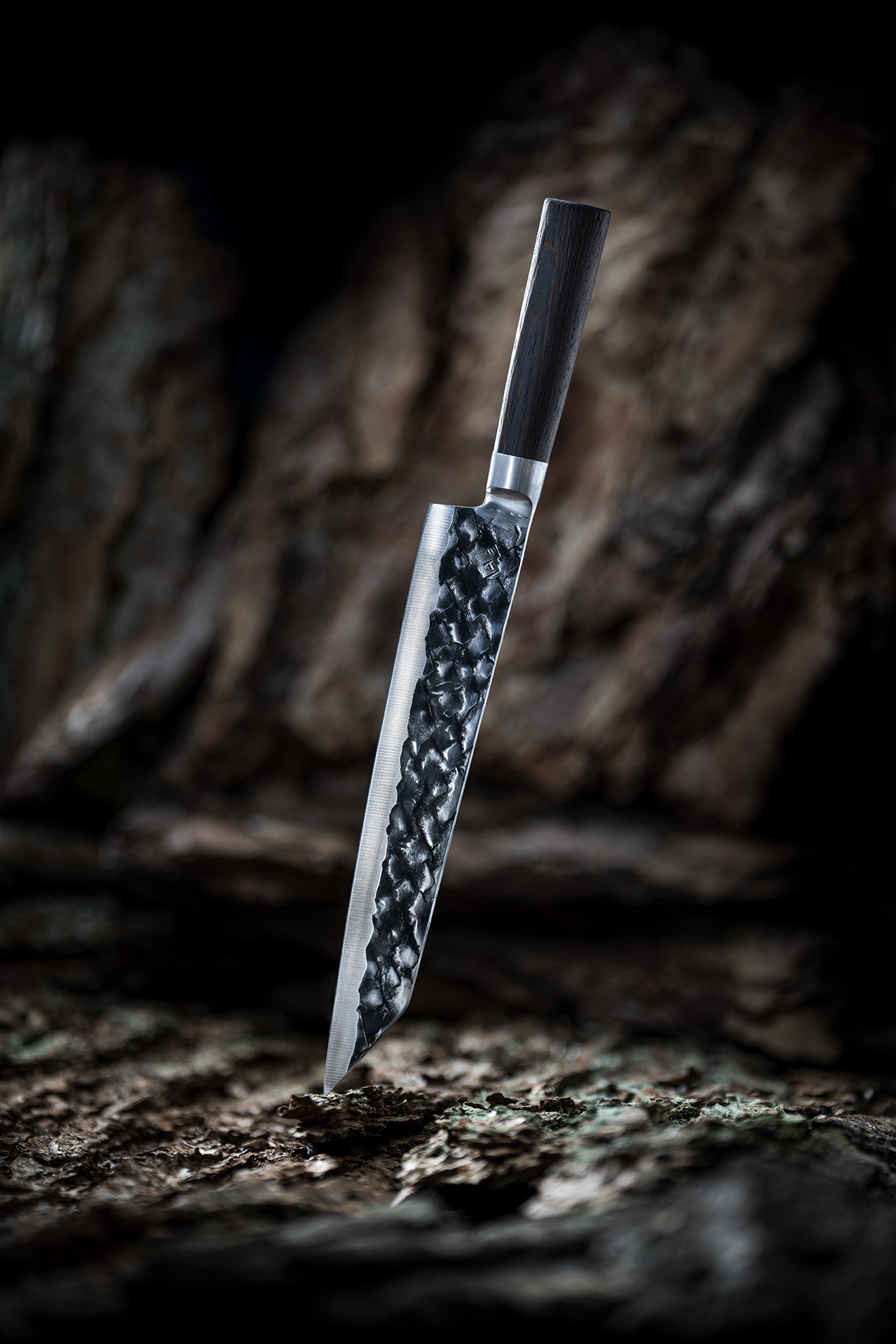 Het Bare Cookware Kiritsuke 240 mm-mes combineert de precisie van een sashimimes met de veelzijdigheid van een chef’s knife. Het lange, smalle lemmet van German Steel (58HRC) is geslepen op een industriële 15°-hoek, zodat je moeiteloos langs visfilets, vlees en groenten glijdt zonder vast te komen zitten. Dankzij de vlijmscherpe snijrand snijd je dunne sashimi-plakken, fijn julienne-werk of stevige steak met één vloeiende beweging.