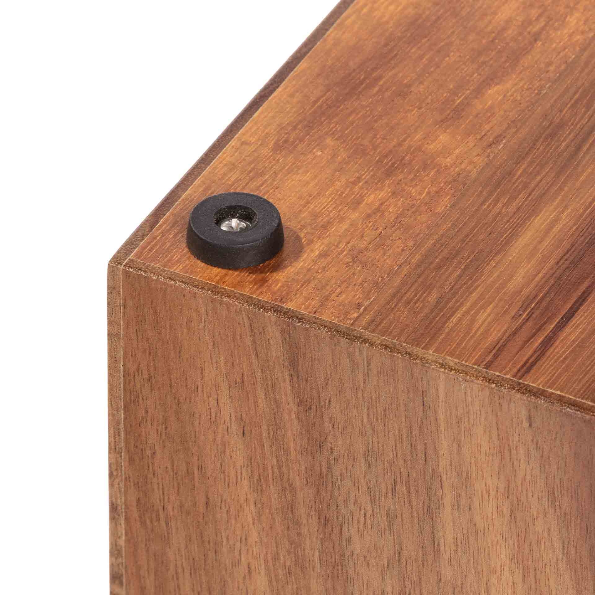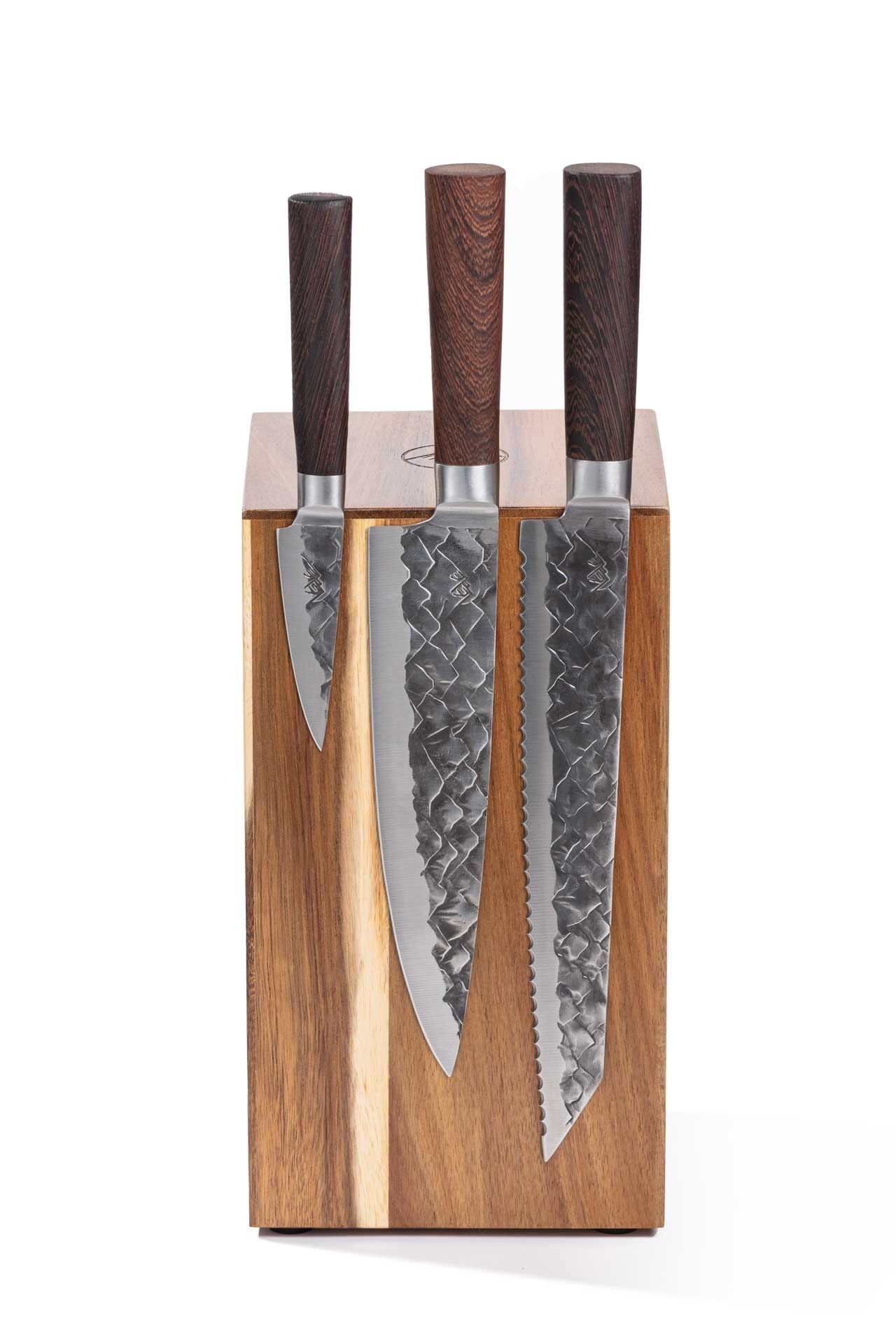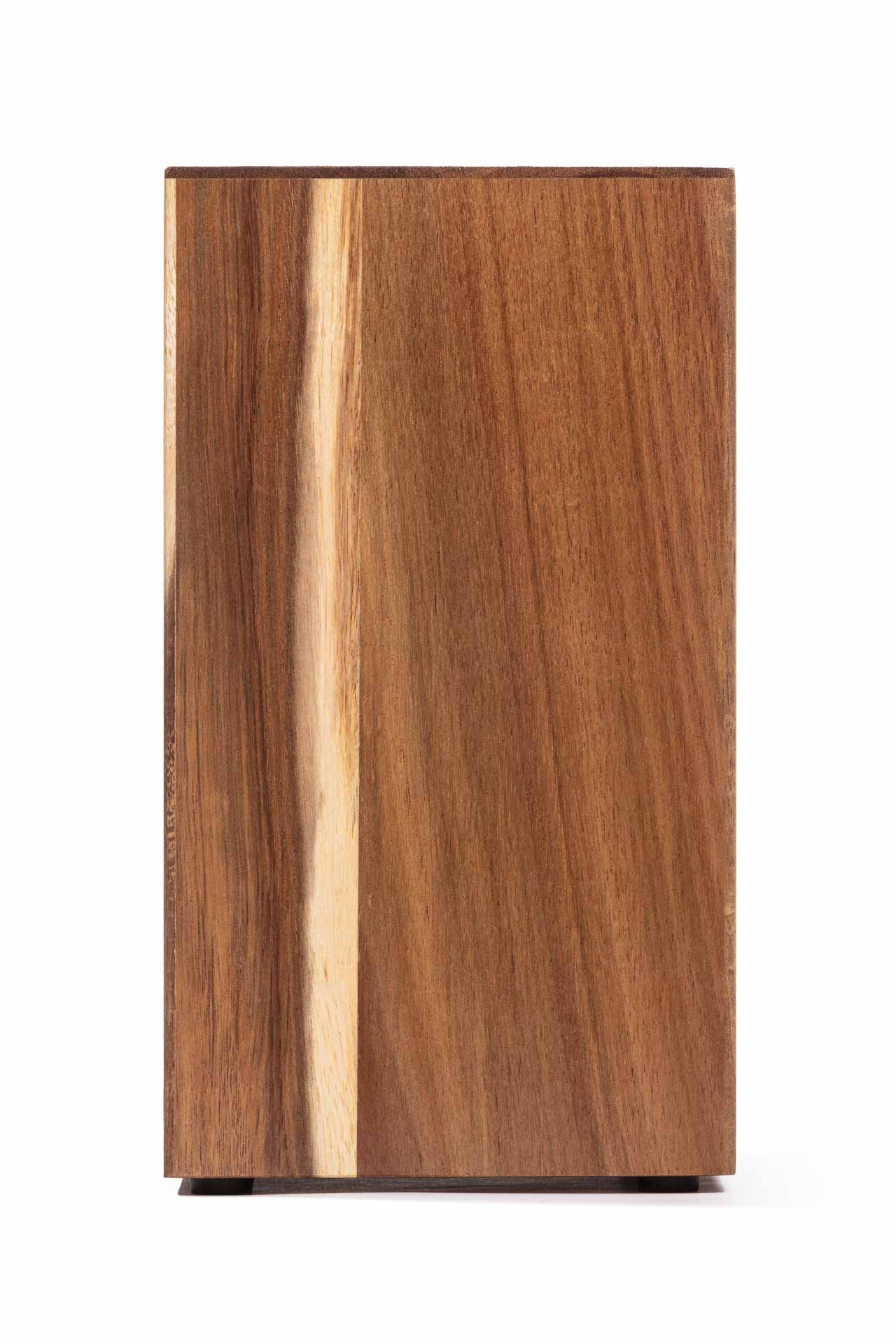 Dit messenblok biedt plek aan meerdere messen tegelijk, van je kleine schilmesje tot zware koksmes, zonder dat je messen aan scherpte inboeten. Door de open, zwevende presentatie houd je bovendien het blad van je messen vrij van vocht en condens, wat roestvorming tegengaat. Het elegante ontwerp past naadloos in elke moderne keuken, terwijl de natuurlijke nerven van het wenge-hout een warm accent toevoegen.