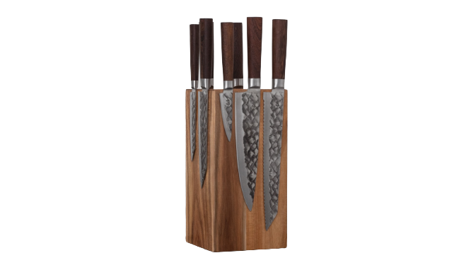 West- en Oosterse Set: Ruimte voor zowel smalle schilmesjes als brede koks- en Santoku-messen.