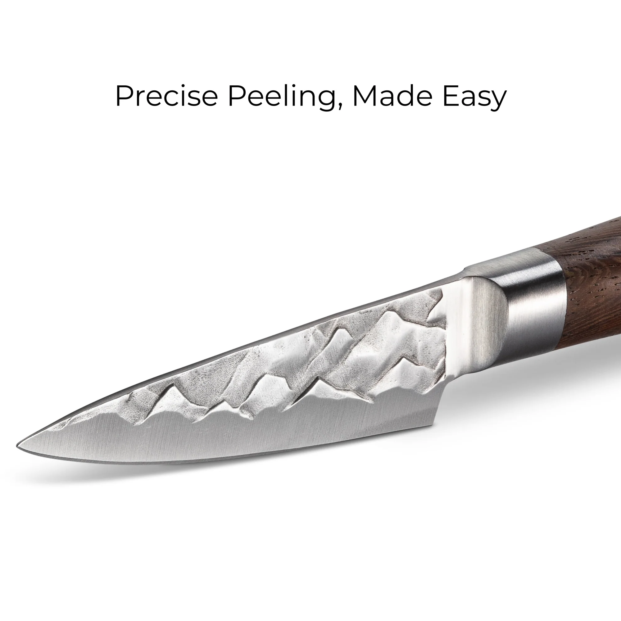 Met de Bare Cookware Paring Knife voeg je een veelzijdig en krachtig keukenmes toe aan je verzameling. Het lemmet van 80 mm (3,1″) is vervaardigd uit Duits chromium-molybdeen-vanadium staal met een hardheid van 58 HRC, wat zorgt voor een blijvende, razendscherpe snede. Dankzij de unieke 3D bergpatroonstructuur op het blad blijft vocht en voedselresten minder snel plakken, waardoor je precieze werkjes zoals het schillen van aardappels, het snijden van kleine groenten of het fileren van fruit moeiteloos uitvoert.