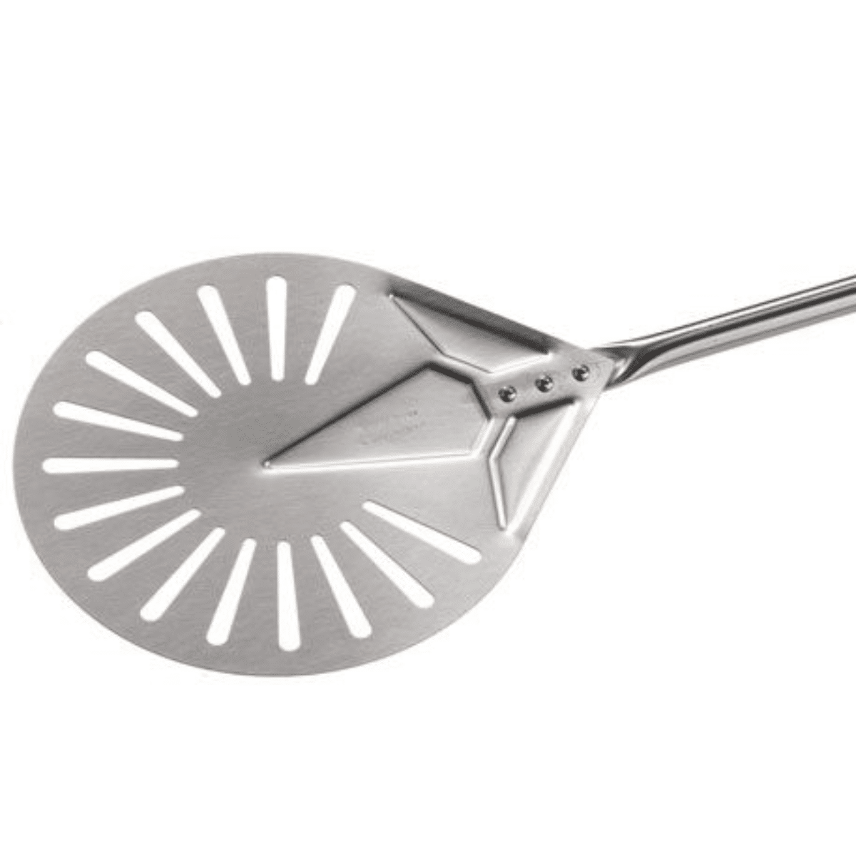 Kleine RVS pizza-draaischep met geperforeerde kop (20×20 cm ≈ 7,9″) en 75 cm ééndelige steel met schuifhandvat. Perforaties verminderen kleven en bloem, voor sneller draaien en uitnemen in hete ovens. Licht, wendbaar en hittebestendig. Lees meer