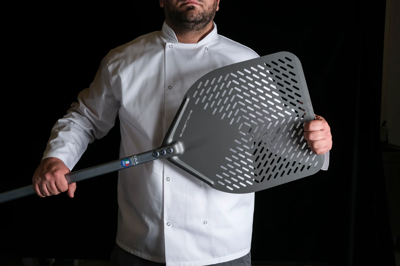 Lichte, rechthoekige pizzaschep uit de Evoluzione-lijn met geperforeerde aluminium kop (33×33 cm) en 60 cm steel. Perforaties laten bloem vallen en verlagen wrijving voor een droge, knapperige bodem. Ideaal om pizza’s te lanceren en uit de oven te halen. Lees meer