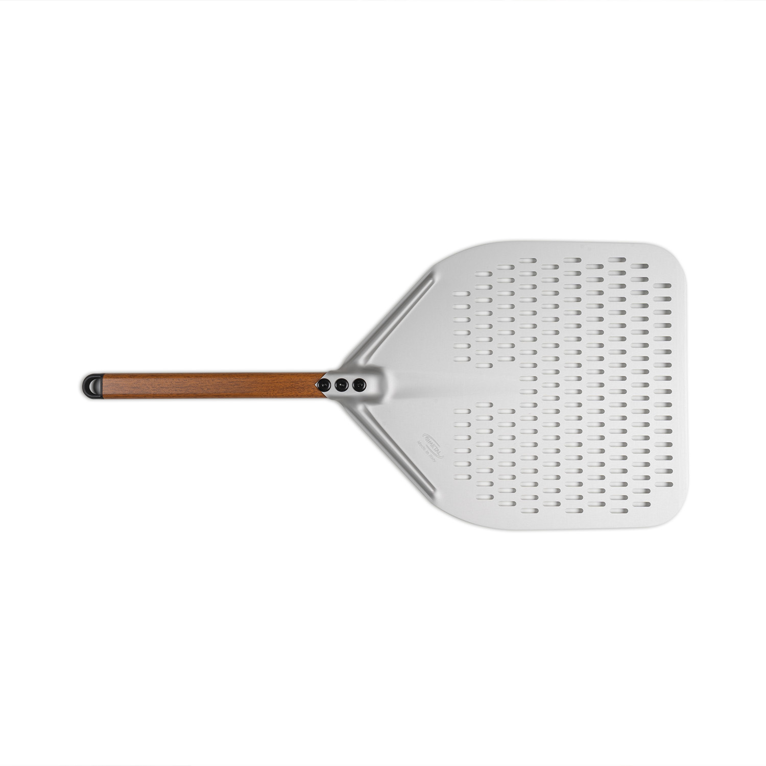 Zoek je de looks van hout met de prestaties van pro-aluminium? De GI Metal WoodTech is jouw geperforeerde pizzaschep voor snel en schoon werken. De geperforeerde kop glijdt onder het deeg, voert bloem/restvocht af en verkleint wrijving, zodat je pizzabodem mooi droog en knapperig de oven in gaat. De neutraal geanodiseerde kop is uniform en beschermd tegen oxidatie, terwijl de aluminium steel met W.E.S. (Wood Effect Sublimation) die warme houtlook geeft zonder concessies aan hygiëne of duurzaamheid. Drie iconische, zwarte klinknagels fixeren de kop stevig aan de steel.