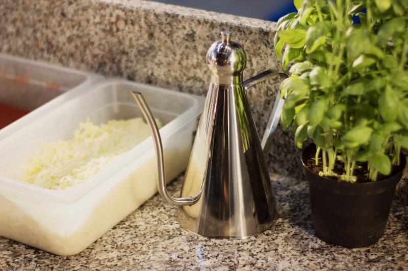RVS oliekan (1,0 L) van Gi.Metal met lange, slanke schenktuit voor een dunne, gelijkmatige straal over pizza of pan. Gemaakt van AISI 304 roestvast staal: hygiënisch, robuust en eenvoudig te reinigen. Ideaal voor (olijf)olie bij elke pizza-opstelling. Lees meer