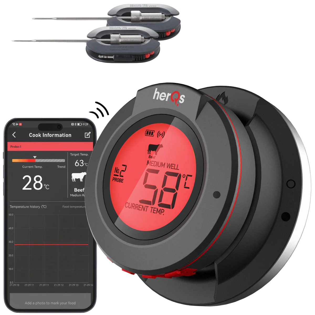 De thermometer maakt verbinding via Bluetooth, waardoor je draadloos kunt communiceren met de HerQs app op je smartphone of tablet. Hierdoor heb je de vrijheid om te ontspannen en tegelijkertijd de temperatuur van jouw dome in realtime te monitoren, zelfs vanuit je luie stoel. Geen gedoe meer met regelmatig controleren of je grill op de juiste temperatuur blijft!