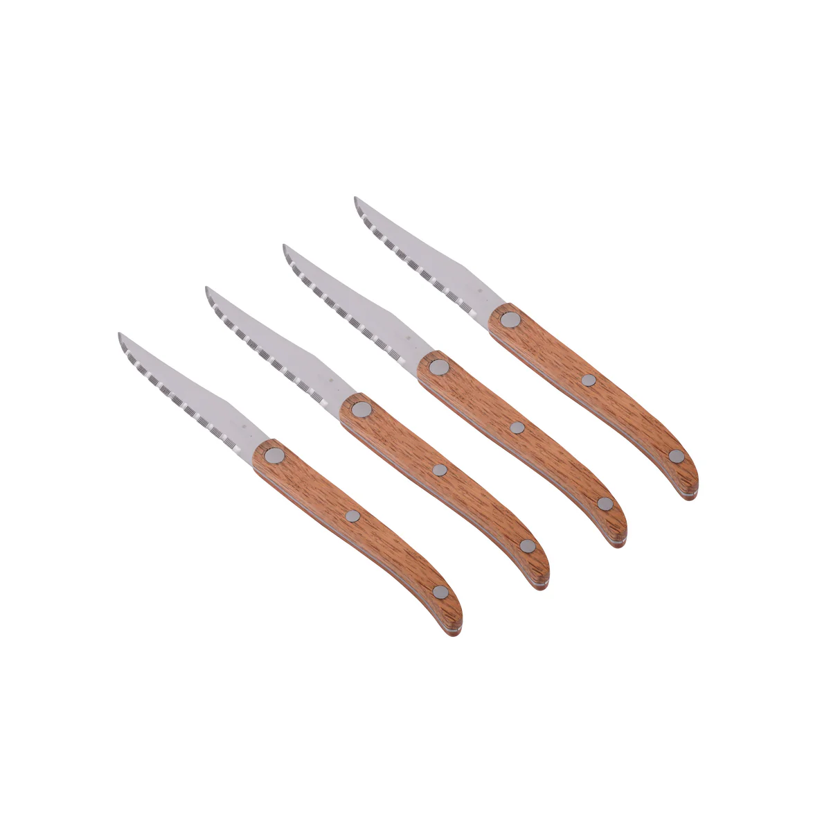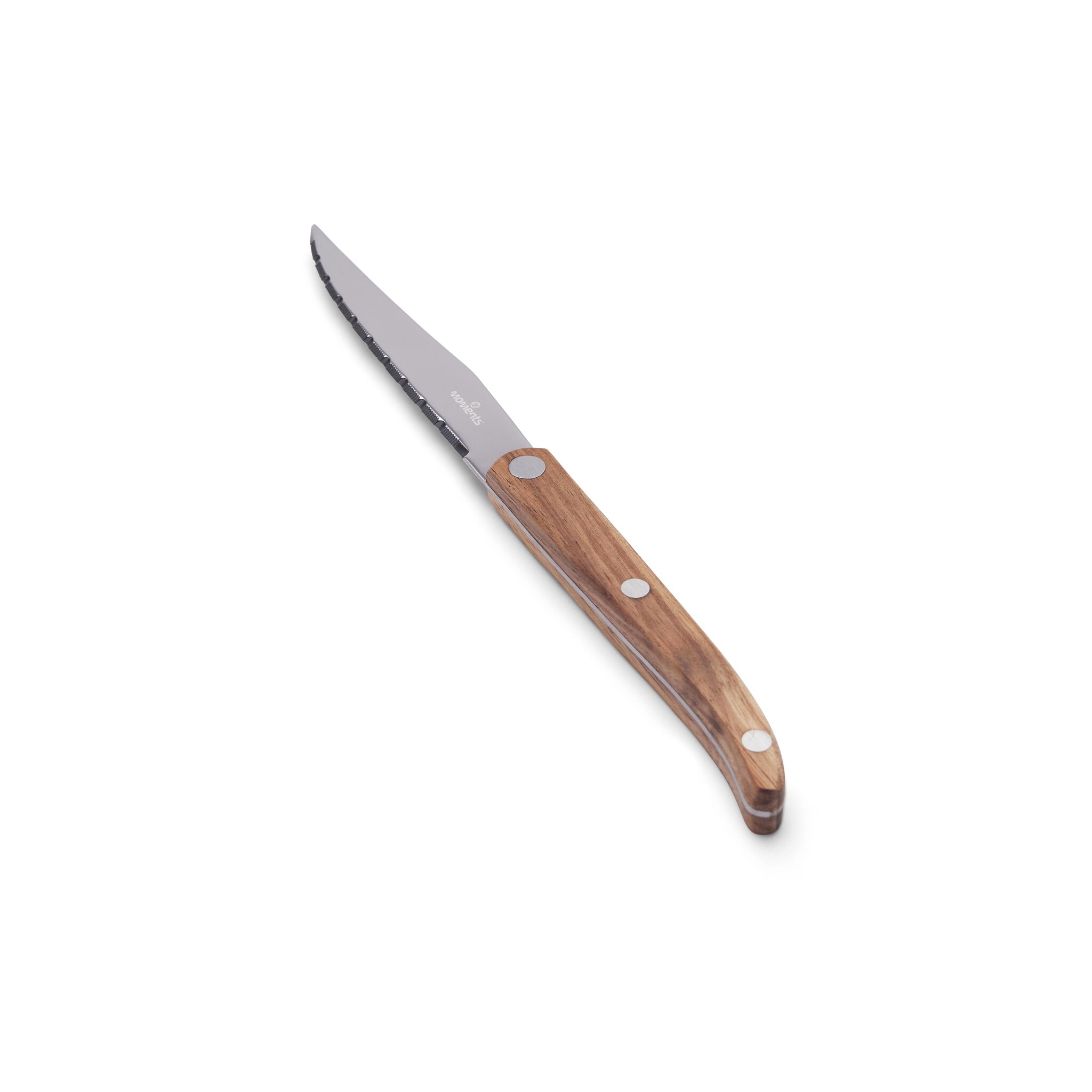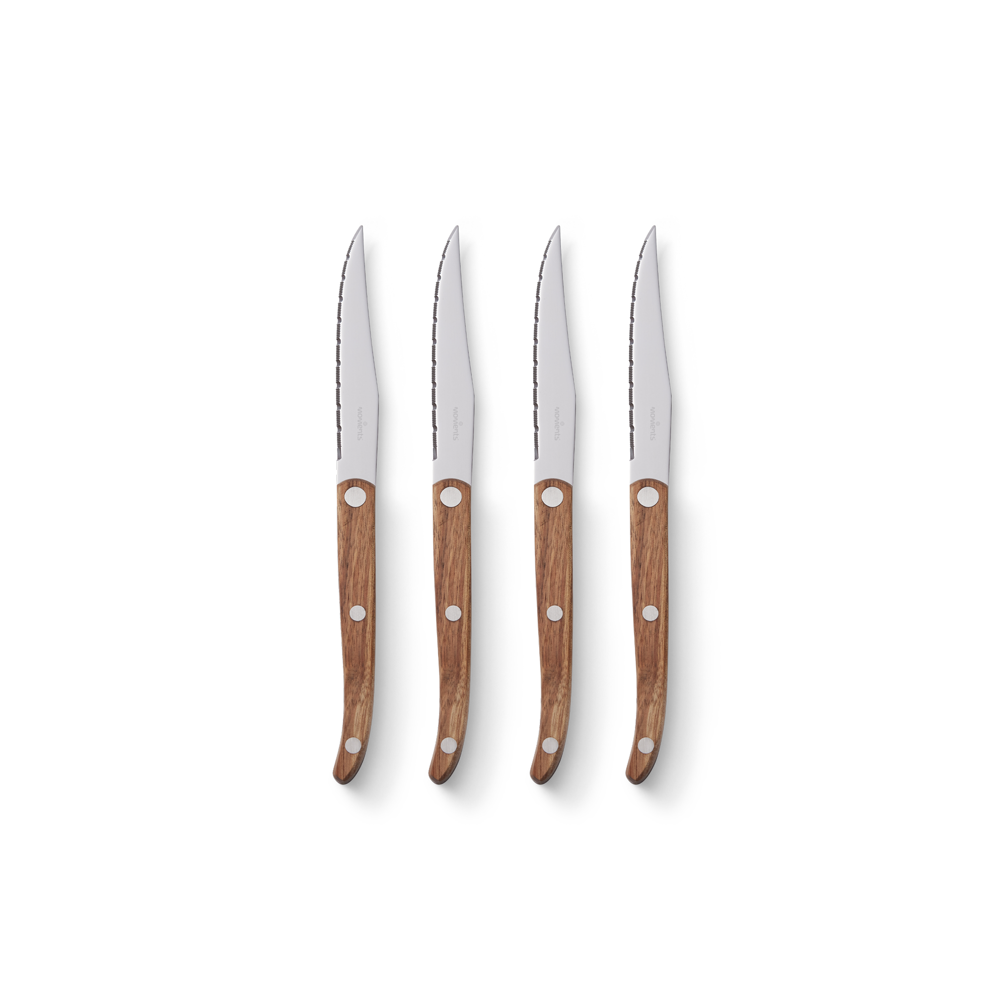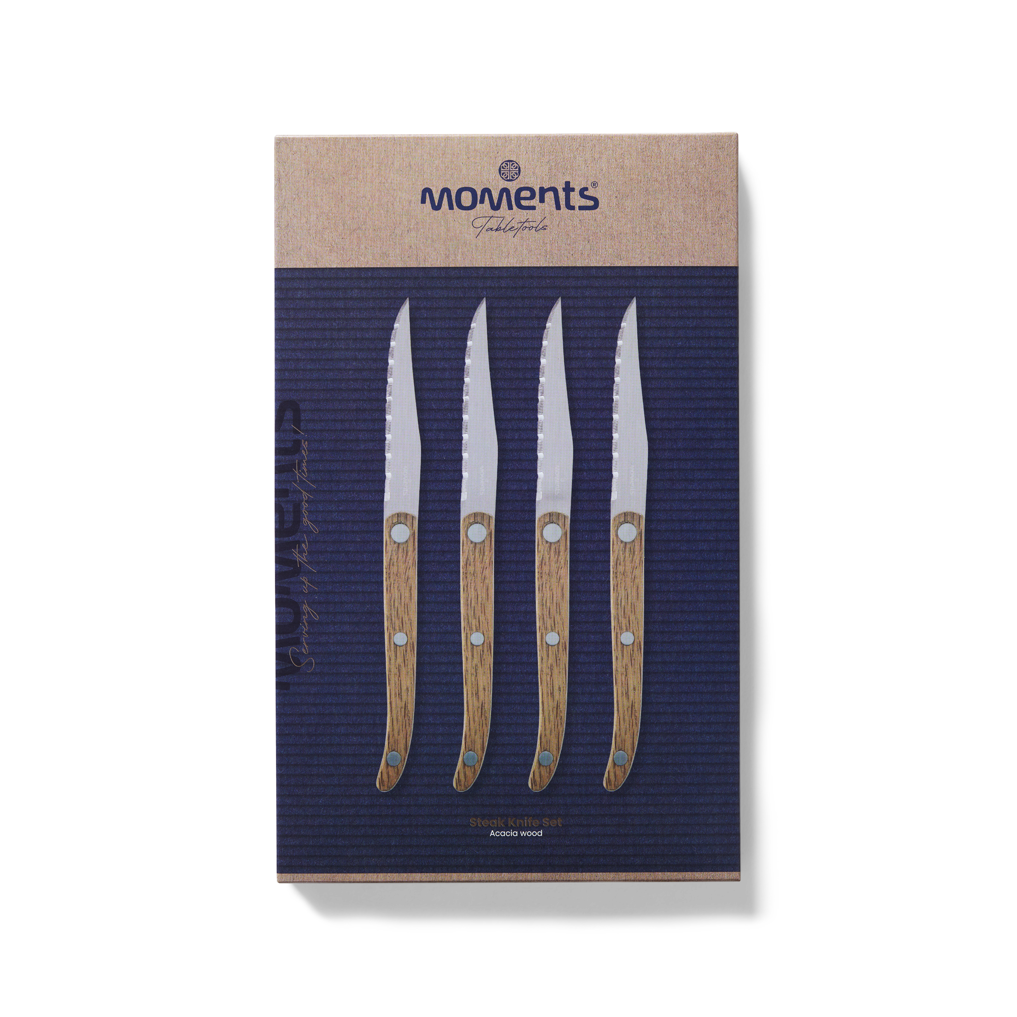 Set van 4 Moments steakmessen met scherp RVS lemmet en warm acacia houten handvat. Snijdt moeiteloos door steaks en gegrild vlees. Stijlvolle messen voor BBQ en diner, geleverd als praktische set van vier. Lees meer