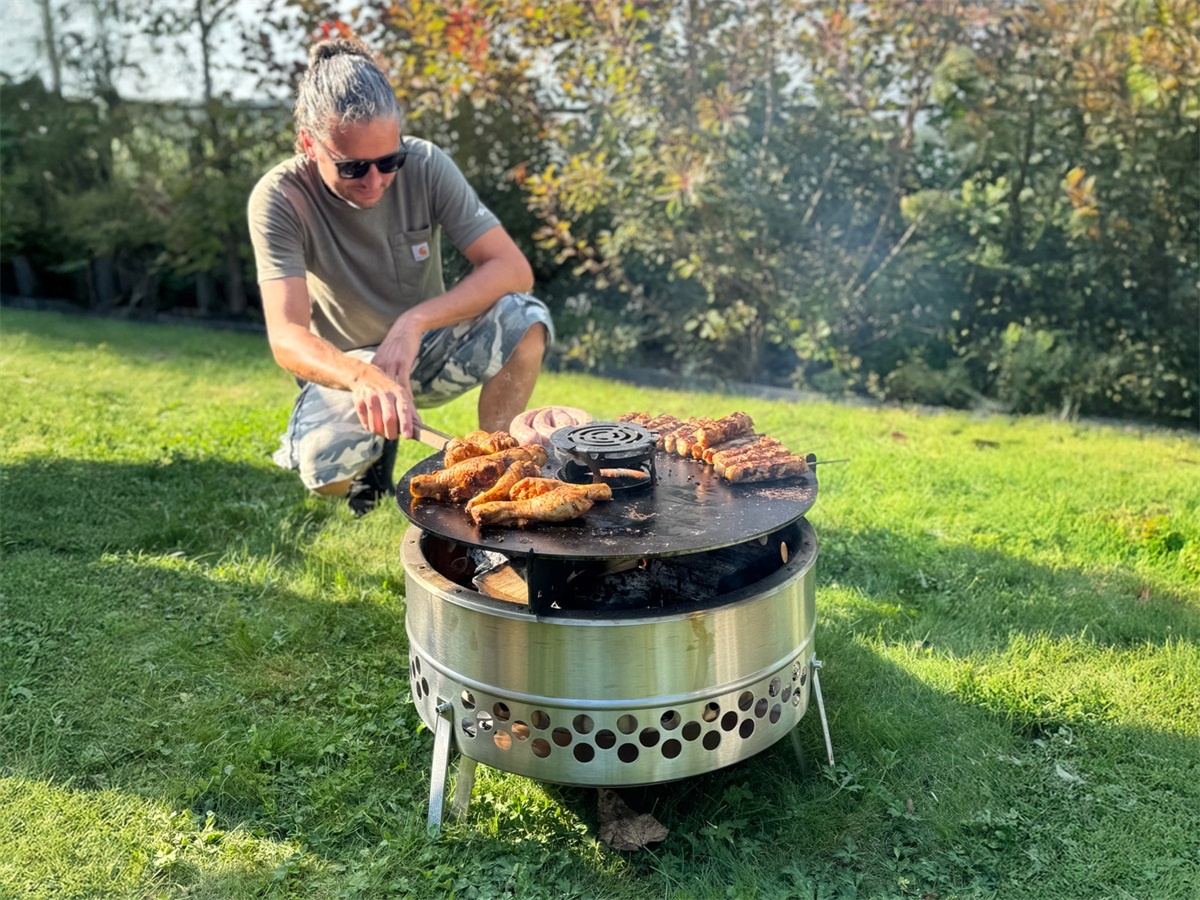 Temperatuur: Na ongeveer 15-30 minuten stoken zal de bakplaat aan de binnenrand een kooktemperatuur van 275 - 300°C hebben bereikt. Als het vuur is aangemaakt kunt u beginnen met de bakplaat in te oliën en doseer wat meer olie wanneer u gaat bakken. Aan de buitenrand is de temperatuur iets lager zodat u kan wisselen met braden en warm houden.